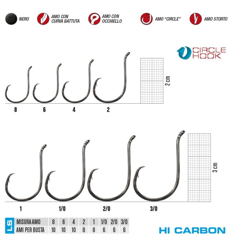 Amo dedicato alla pesca in profondità di occhioni con tranci di sarda o calamaro, dove eccelle per la tenuta durante il lungo recupero. In sostanza, la sua forma offre la collaudata efficacia della serie Octopus (12840) con la sicurezza supplementare determinata dal profilo “Circle” della sua punta.La sua efficienza si esalta nelle tecniche che prevedono l’auto-ferrata del pesce, come nel caso dell’impiego dei mulinelli elettrici. Storto e di colore nero, è provvisto di un occhiello piegato all’esterno per consentire la legatura
